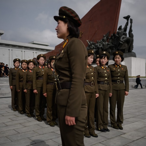 ედ ჯონსი - ფხენიანი, ჩრდილოეთ კორეა: ქალი არმიელები ერის მამების, კიმ ირ სენისა და კიმ ჩენ ირის ძეგლებთან.