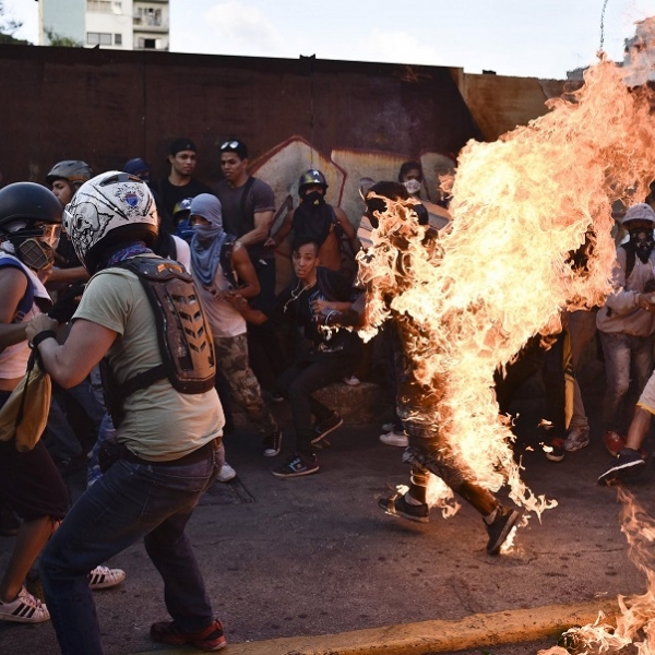 კარლოს ბესერა - კარაკასი, ვენესუელა: პრეზიდენტ ნიკოლას მადუროს საწინააღმდეგო გამოსვლების დემონსტრანტმა ორლანდო ფიგერამ სხეულის 80%-ის დამწვრობა მიიღო.