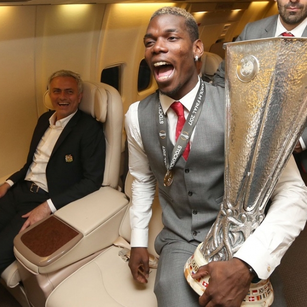 ჯონ პიტერსი - სტოკჰოლმი, შვედეთი: „მანჩესტერ იუნაიტედის“ ფრანგი ნახევრამცველი პოლ პოგბა და პორტუგალიელი მთავარი მწვრთნელი ჟოზე მოურინიო ევროპა ლიგის თასით ხელში თვითმფრინავში გამარჯვებას აღნიშნავენ.