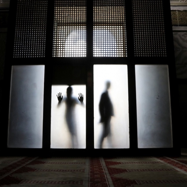 ამარ ავადი - იერუსალიმი, პალესტინა: ადამიანთა სილუეტები მეჩეთ კლდის გუმბათში.
