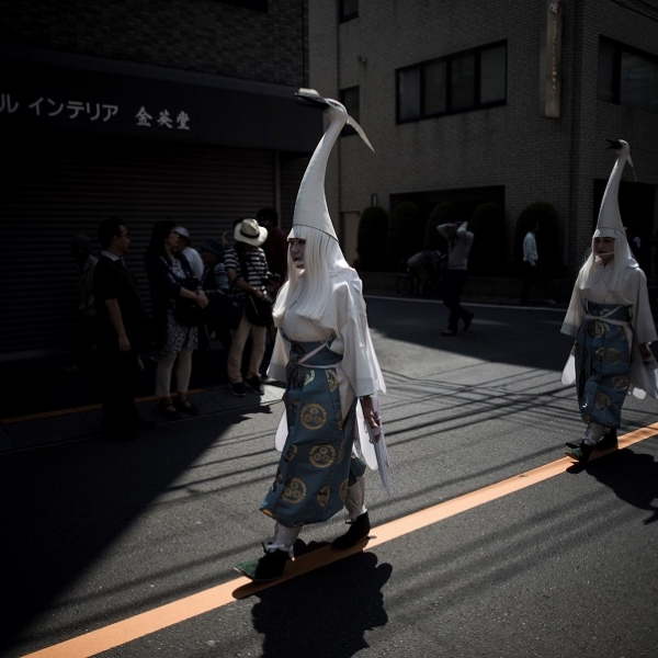 ფრედ დუფური - ტოკიო, იაპონია: ყანჩასთავიან კოსტიუმებში გამოწყობილი ადამიანები სანძა მაცურის ანუ ზაფხულის დადგომის სამდღიან ფესტივალზე.