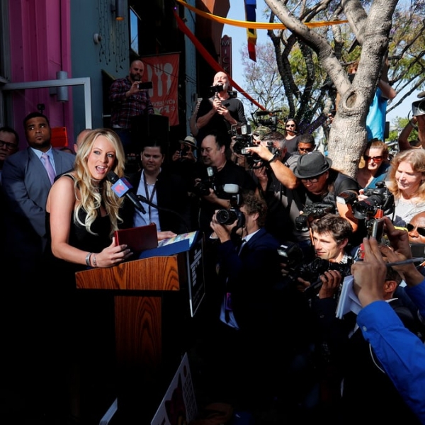 მაიკ ბლეიკი - ლოს ანჯელესი, კალიფორნია: დონალდ ტრამპთან სასამართლო დავაში მყოფი პორნოვარსკვლავი სტორმი დენიელსი (სტეფანი კლიფორდი) პრესკონფერენციაზე. 39 წლის პორნოვარსკვლავის თქმით, დონალდ ტრამპმა 2016 წლის ოქტომბერში მას 130 000 დოლარი გადაუხადა მასთან ა