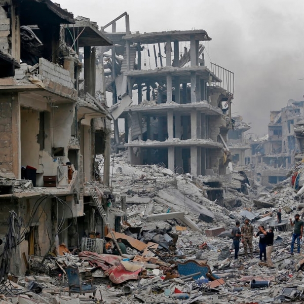 ლუაი ბეშარა - ჰაჯარ ალ-ასვადი, სირია: ქვეყნის სამთავრობო ძალების წევრები დედაქალაქის დანგრეულ გარეუბანში.