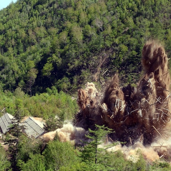KCNA - პუნგიე-რი, ჩრდილოეთ კორეა: ბირთვული ტესტებისთვის განკუთვნილი შენობის დემონტაჟი.