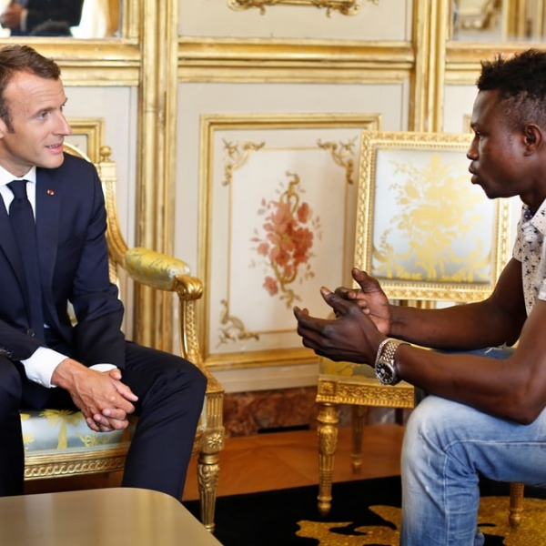ტიბო კამიუ - პარიზი, საფრანგეთი: საფრანგეთის პრეზიდენტი ემანუელ მაკრონი მალელ მიგრანტ მამუდუ გასამას ხვდება.