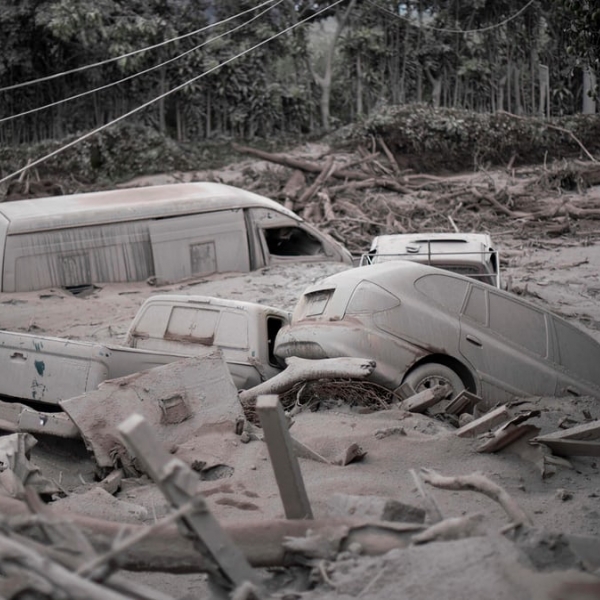 იოჰან ორდონოსი - სან მიგელ ლოს ლოტესი, გვატემალა: ვულკან „ფუეგოს“ ამოფრქვეული ფერფლით დაფარული საცხოვრებლები.