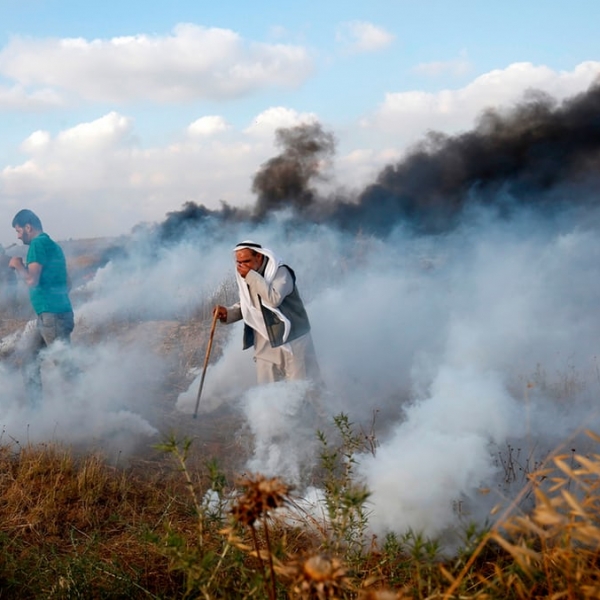 საიდ ხათიბი - ღაზა, პალესტინა: პალესტინელი დემონსტრანტები ისრაელის სპეცრაზმელების მიერ გაშვებული ცრემლსადენი გაზის ფონზე.
