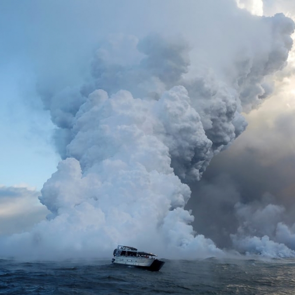 ტერეი სილვესტერი - ჰავაი: ტურისტული იახტა ზღვაში ჩაღვრილი ვულკან კიალუეას ლავის ფონზე.