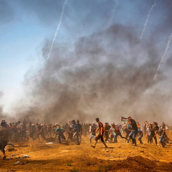 მოჰამედ აბედი - ღაზა, პალესტინა: პალესტინელი დემონსტრანტები ისრაელის სპეცრაზმელების მიერ გაშვებული ცრემლსადენი გაზის ფონზე.