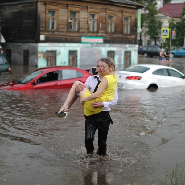 ლუსი ნიკოლსონი - ნიჟნი ნოვგოროდი, რუსეთი: დატბორილ ქუჩაში ატირებული ქალი მისი მანქანიდან მამაკაცს უსაფრთხო ადგილას გადაჰყავს.