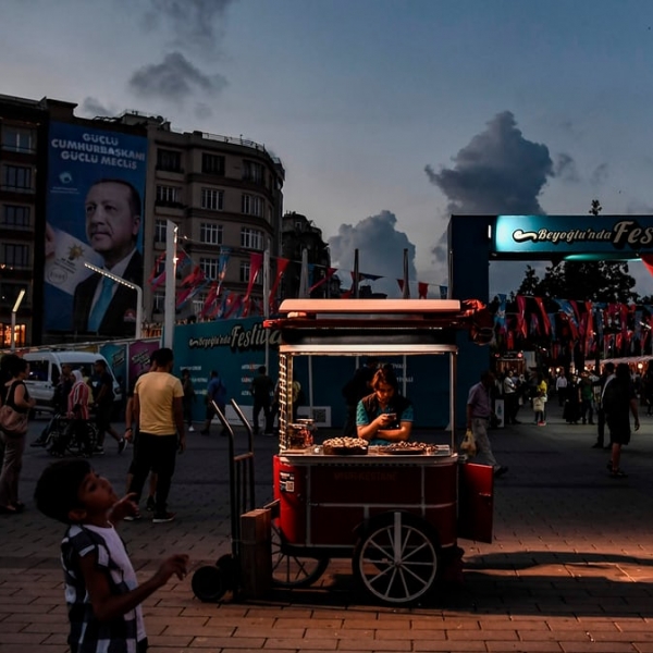 არის მესინისი - სტამბოლი, თურქეთი: თაქსიმის მოედანზე შემწვარი წაბლის გამყიდველი რეჯეფ თაიფ ერდოღანის საპრეზიდენტო საარჩევნო პლაკატის ფონზე.