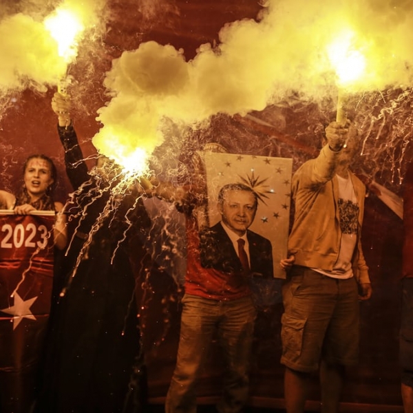 ემრა გურელი - სტამბოლი, თურქეთი: რეჯეფ თაიფ ერდოღანის მხარდამჭერები მაშხალებით ხელში ზეიმობენ პოლიტიკოსის პრეზიდენტად არჩევას.