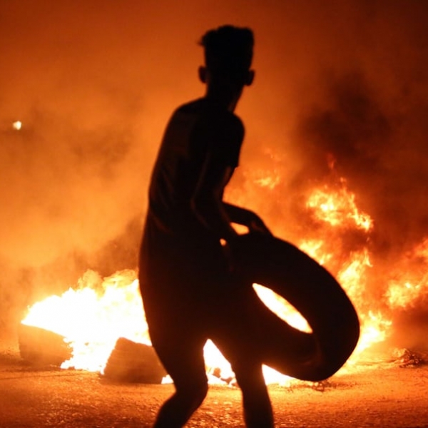 ჰაიდარ მოჰამედ ალი - ბასრა, ერაყი: დემონსტრანტი საბურავებს წვავს უმუშევრობის წინააღმდეგ გამართულ საპროტესტო აქციაზე.
