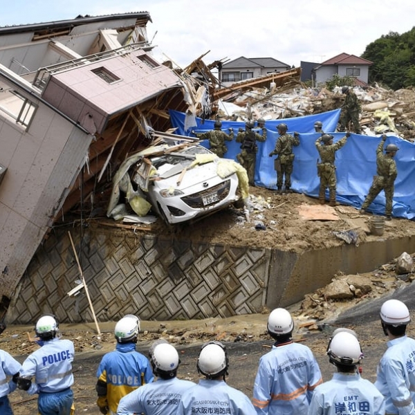 Reuters - კუმანო, იაპონია: გადაუღებელი წვიმების შედეგად დაზიანებულ საცხოვრებლებთან სამაშველო ჯგუფი მუშაობს.