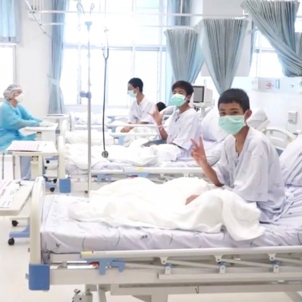 Reuters - ჩიანგ რაი, ტაილანდი: დატბორილ გამოქვაბულში სამაშველო ოპერაციისას გადარჩენილი ტაილანდელი ბიჭუნები ჰოსპიტალში გადიან მკურნალობას.