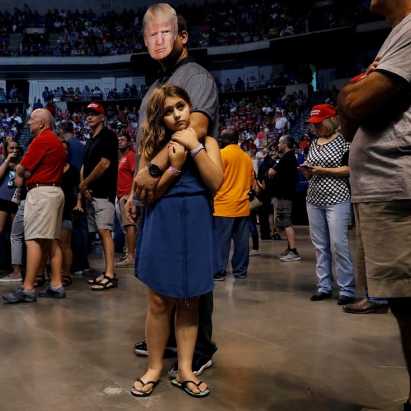 ლეა მილისი - უილკს-ბარი, პენსილვანია: თომას მუზოლინო დონალდ ტრამპის ნღბით ქალიშვილ ჯანასთან ერთად ტრამპის მხარდამჭერ კამპანიაზე.