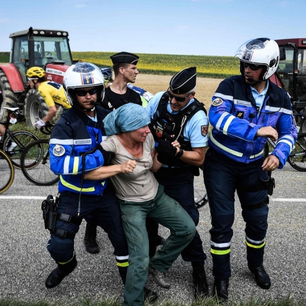 ჯეფ პაშუ - კარკასონი, საფრანგეთი: საპროტესტო აქციის მონაწილე ფერმერს „ტურ დე ფრანსის“ ტრასაზე აკავებენ.