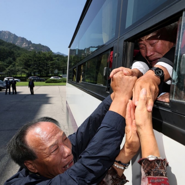 Reuters - კუმგანის მთა, ჩრდილოეთ კორეა: გაცალკევებული ოჯახის წევრები ხანმოკლე ერთად ყოფნის შემდეფ ერთმანეთს ემშვიდობებიან.