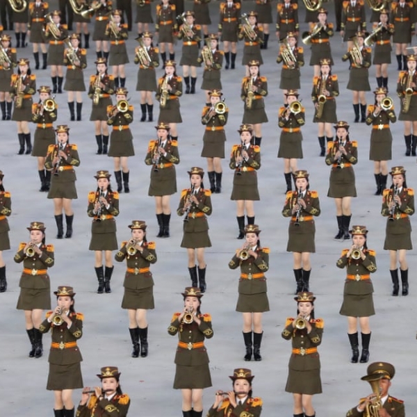 EPA - ფხენიანი, ჩრდილოეთ კორეა: გოგონათა ანსამბლი სამხრეთ კორეის პრეზიდენტის ვიზიტზე მაისის დღის სტადიონზე გამოსვლისას.