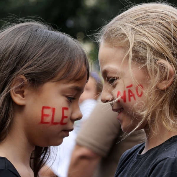 ანა კაროლინა ფერნანდესი - რიო დე ჟანეირო, ბრაზილია: საპრეზიდენტო კანდიდატ ჟაირ ბალსონაროს საწინააღმდეგო აქციაზე ბავშვებს სახეზე წარწერა აქვთ „ის არა“.