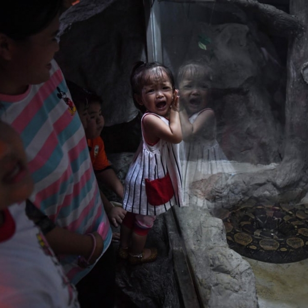 ლილიან სუვანრუმპჰა - ბანგკოკი, ტაილანდი: პატარა გოგონას რეაქცია ზოოპარკში ბირმული პითონის დანახვისას.